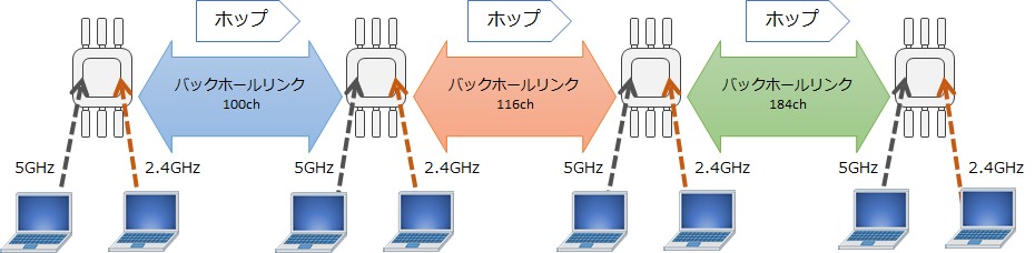 により、バックホールのUp-Link、Down-Link、アクセスポイントで、それぞれに独立したチャンネルでの接続を効率良く行うことを可能とし、多段ホップでのスループット低下という課題を、大幅に改善しています。(図2、図3)