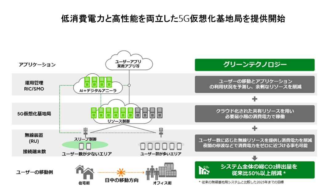 5G仮想化基地局は、クラウド化された共有リソースを用い、必要最小限の消費電力で稼働します。ユーザー数が増えたら、リソース制御により稼働設備を増やすことが容易にできます。逆に、夜間の停波などで消費電力をゼロに近づけることも可能です。ユーザーの稼働とアプリケーションの利用状況を予測し、余剰なリソースを削除するコントロールを、AIとデジタルアニーラが行います。リソースを人口に合わせて配分することで低消費電力を実現し、従来型の基地局システムと比較してCO2排出量の50%以上削減が可能です。