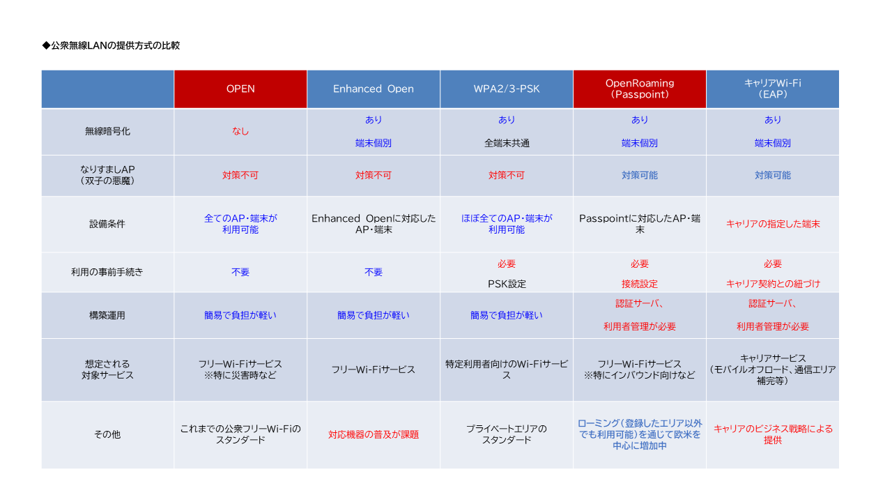 実際、利用者からは、「Wi-Fiはセキュリティが怖いから使ってないんです」と言う声を聞きます。「Wi-Fi」イコール「危ない」「忌避する」とWi-Fi自体のイメージが非常に悪くなっている。セキュリティの高度化を通じて「セキュリティを担保したものがあるんですよ」という話を広めていくことに取り組んでいくことは重要です。
