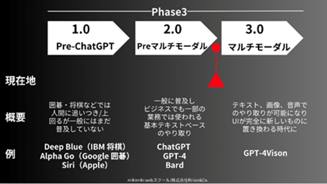 これを解決するのが、AGI(Artificial General Intelligence)でトップダウンの知識・ルールを与えると解釈・推論することができ、積極的に提案を行う存在となることが期待されます。また、Phase3には、さらに3つの段階が存在し、「Pre-ChatGPT」では、囲碁や将棋で人間に追いついたレベルや例としてSiriなどが挙げられます。「Preマルチモーダル」では、ビジネスでの一部の業務で使用されるなど、段階的に機能が追加されています。そして、「マルチモーダル」では、テキスト・画像・音声でのやり取りが可能になり、新たなUIが考えられています。