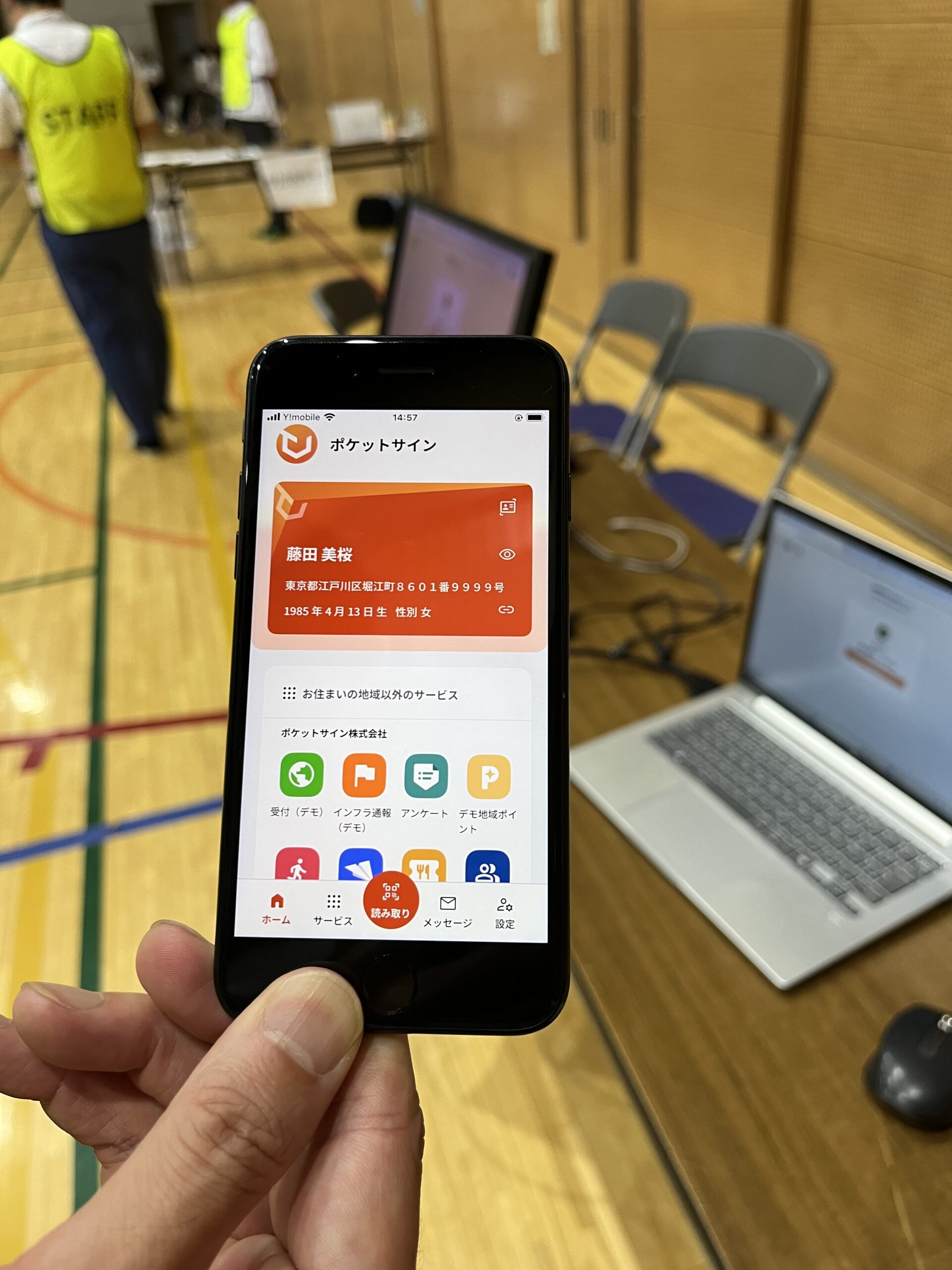 会場では、避難所受付を模擬的に再現し、災害時に「安全かつ迅速な避難」と効率的な「避難所運営」をサポートする機能を搭載したサービス「ポケットサイン」を利用し、各自治体の職員が避難者側、受付側の双方の立場で体験を行いました。