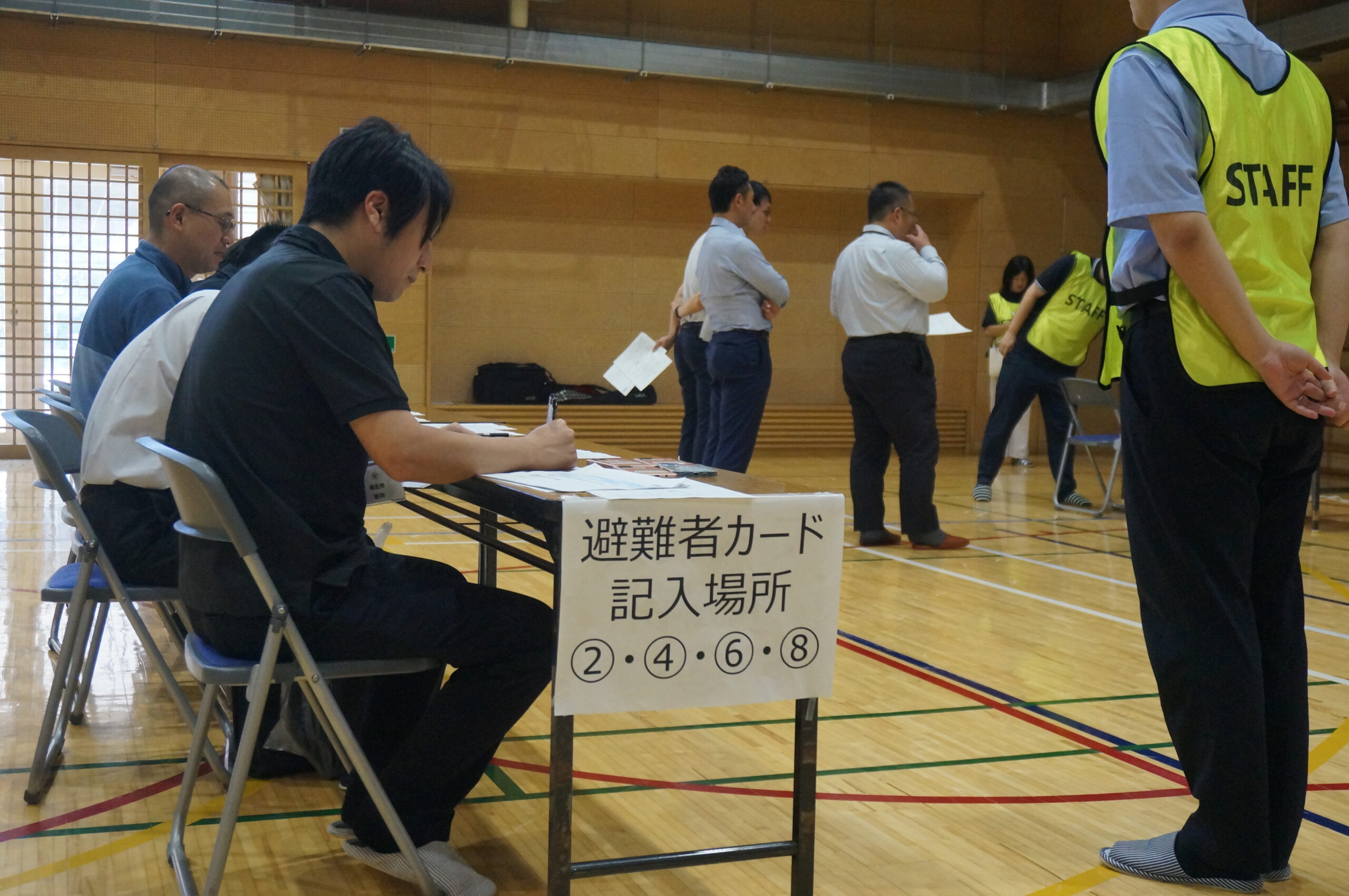最初は、従来型の方法として利用されていることも多い紙の受付カードによる体験を実施。避難者は紙に必要事項を記入する必要があるため、相当の時間が掛かりました。また、受付をする自治体側も、カードに記入された情報を手入力でリスト化する作業があるため、時間がかかることに加え、入力ミスの可能性もあることを体感しました。