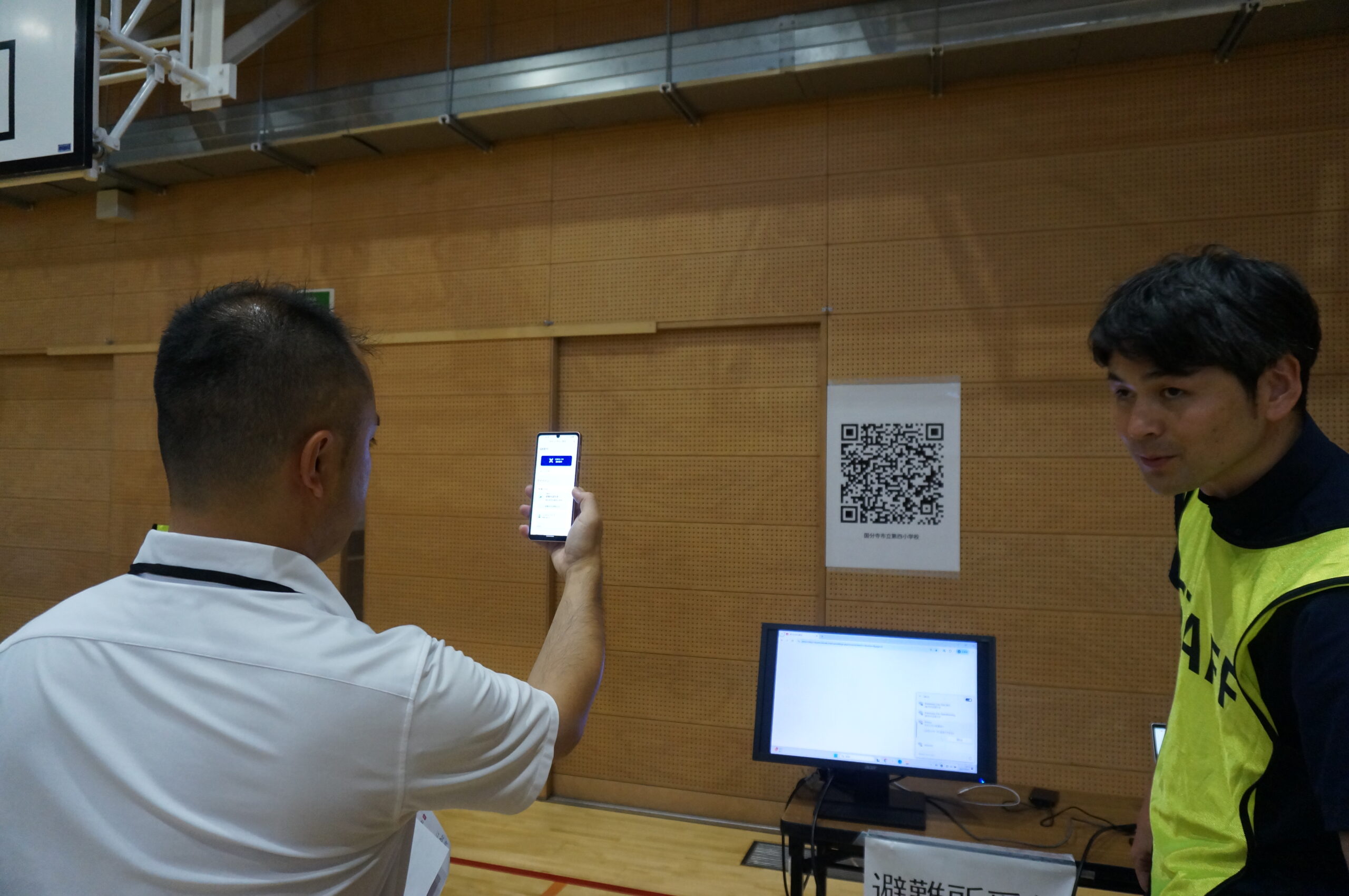 この日用意された避難所受付手段は、紙 、QRコード、オフライン、 Wi-Fi自動チェックインの4つで、順番に体験を実施。