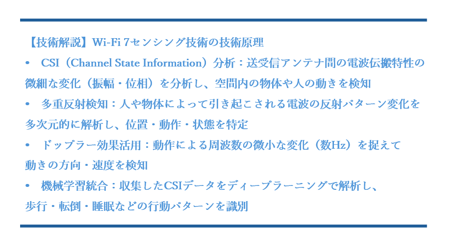 Wi-Fi 7において最も注目すべき革新が、Wi-Fiセンシング技術です。この技術は、IEEE 802.11bf標準に基づく革新的技術で、2.4GHz、5GHz、6GHzの3つの周波数帯すべてを活用して人の動きや行動を検知します。Wi-Fi通信で使用される電波の多重反射とドップラー効果を利用し、CSI(チャネル状態情報:Channel State Information)を分析することで、カメラを使わずにプライバシーに配慮した見守りサービスが実現できます。
