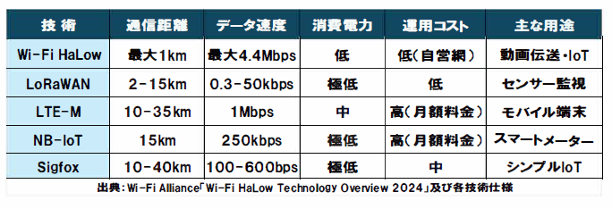 従来のLPWA(Low Power Wide Area)との比較において、Wi-Fi HaLowは独自のポジションを確立しています。LoRaWANが数kbpsの低速通信でセンサーデータ中心なのに対し、Wi-Fi HaLowは動画伝送も可能な高速通信を提供します。LTE-M/NB-IoTがセルラー網に依存し月額料金が必要なのに対し、Wi-Fi HaLowは自営網での運用により、ランニングコストを大幅に削減できます。