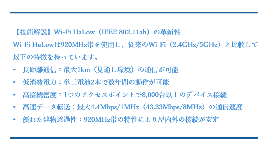最近、Wi-Fi関連技術が急速に進歩し、業界の注目を浴びています。その中でも特に注目されているのが、IoTやセンサー、遠隔監視などに特化したWi-Fi HaLow(IEEE 802.11ah)の実用化です。この技術は、従来のWi-Fiの概念を大きく拡張し、新たなビジネス領域を切り拓く可能性を秘めています。