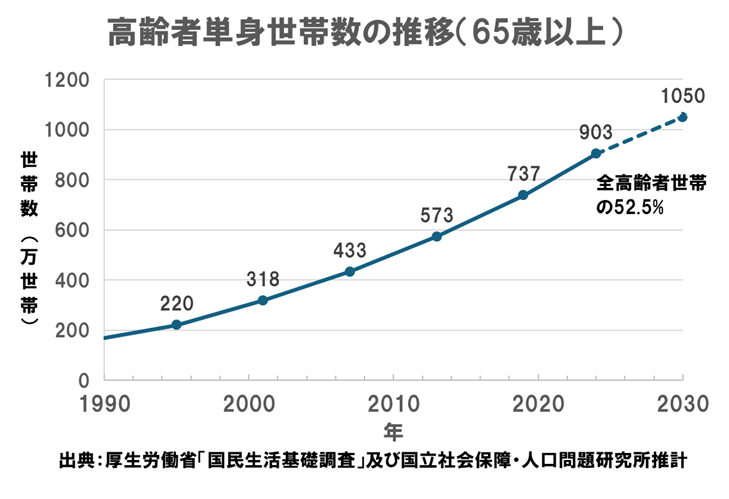 日本は世界で最も急速に進行する超高齢化社会の最前線にあり、65歳以上の単身世帯は903万世帯(2024年、厚生労働省)※4に達しています。これは全高齢者世帯の52.5%を占める深刻な状況であり、今後さらに増加が予想されます。2040年には1,200万世帯を超えると推計されており、見守りサービスの需要は急激に拡大しています。