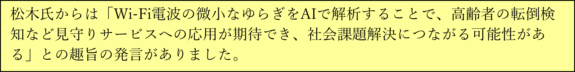 Wi-Fiセンシング機能を使うことで、住人が通常通りのパターンで生活しているか、あるいは倒れて動けなくなっているかといったことも判断できるようになります。AIが個人の生活パターンを学習し、通常と異なる状況を検知した際に、家族や介護事業者に自動通知するシステムが実用化されています。今やどこの家庭にもあるWi-Fiのアクセスポイントによって、カメラなどを使わず、プライバシーに配慮した見守りサービスが提供できれば、日本が直面する大きな社会問題の解決につながる可能性があります。