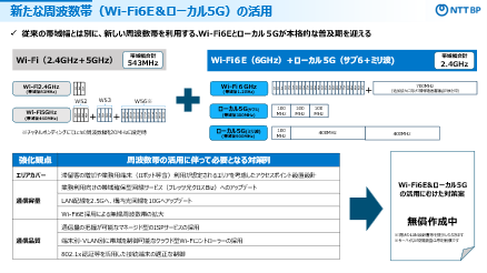 加えて、無線品質の維持・向上を確実に進めるためには、新しい無線帯域の積極的な利活用が欠かせません。NTTBPではWi-Fi6Eやローカル5Gを現場でどう活かすかという観点で、導入コンサルティングの強化や、試行しやすいようにローカル5Gの短期レンタルサービスも展開し、より多様な現場に即したソリューション提供を進めています。