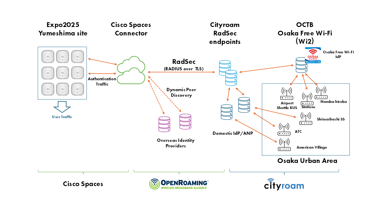図にありますように、会場アクセスポイント(ANP)はCisco Spaces、ID提供プロバイダ(IdP)はOsaka Free Wi-FiではOpenRoamingへの接続点が異なっています。Osaka Free Wi-Fiのプロファイルをインストールした端末は会場内でアクセスポイントに接続するとCisco SpacesのOpenRoamingエンドポイントからCityroamの認証ゲートウェイを経由し、Osaka Free Wi-FiのIdPサーバに認証要求が行われます。
