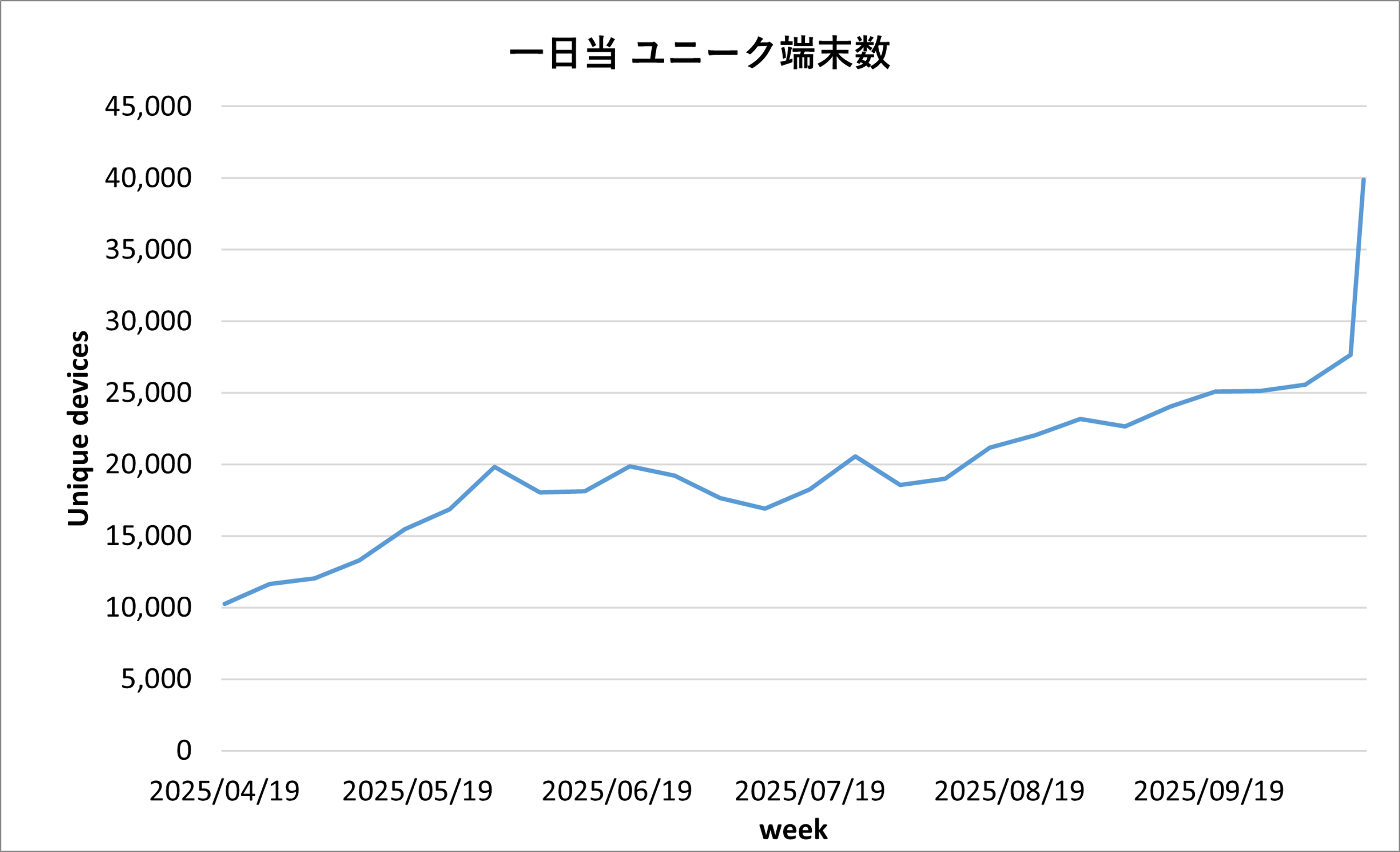 初日翌日が最も少なく、一般来場者数70,488人に対して、認証でユニーク端末数は約6,500台です。右肩上がりに増えていき、10月の一般来場者が24万人を超える日には、ユニーク端末数が30,000台を超える日が出て来ました。