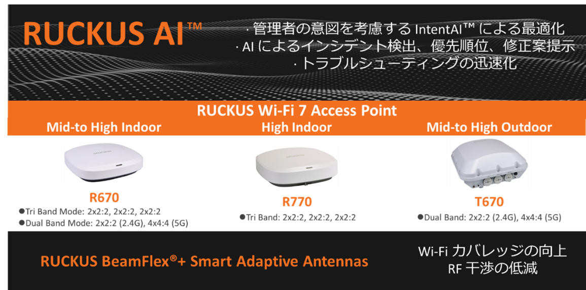 RUCKUS製品は、①Wi-Fi 7の最新技術、②RUCKUSアンテナテクノロジー(BeamFlex+®)、③AIによる導入および運用サポートを融合させた、“Wi-Fi 7以上”の価値を提供する無線LANソリューションです。
